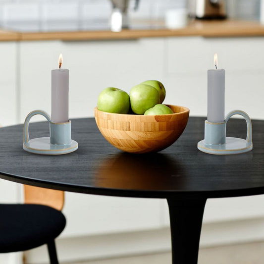 Set of Two Candlesticks-Glazed White-Rustic-Earthy-Robin's Egg Blue-Short-Small-Vintage-Boho-Retro
