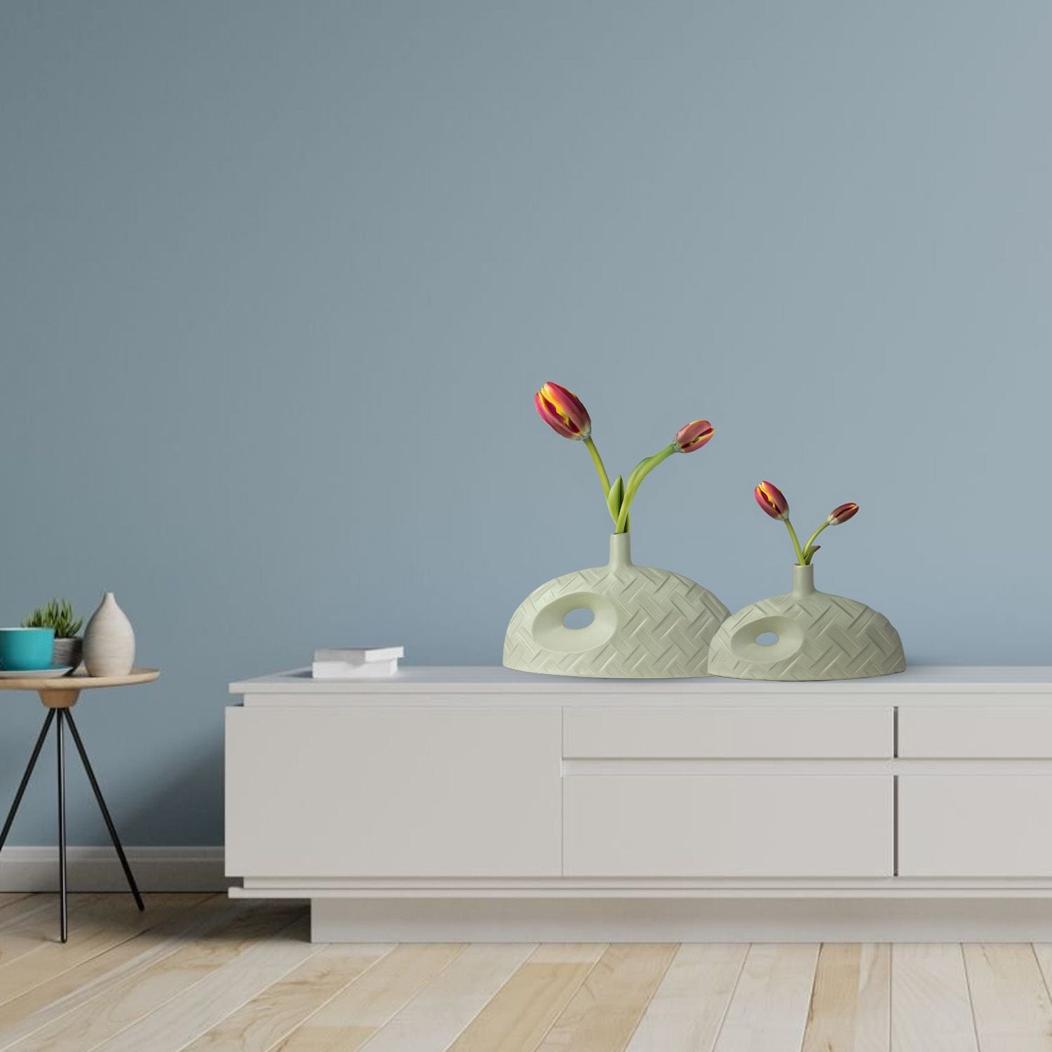 Crafted with a keen eye for design, these vases draw inspiration from classic water vessels, creating a sense of nostalgia and grace. The pristine white color exudes purity and complements any decor style, while the textured weave pattern adds depth and character to their appearance.