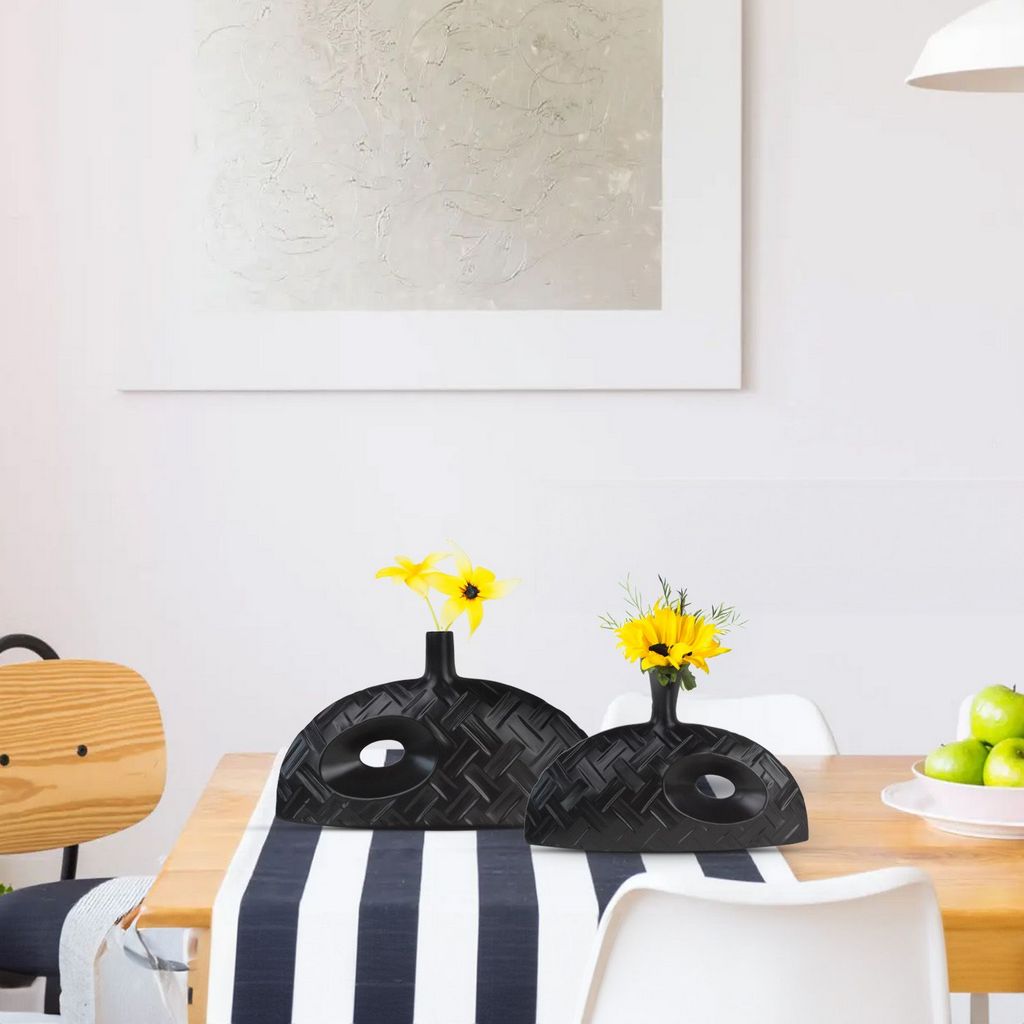 Whether you're looking to infuse your decor with a touch of timeless elegance or seeking the perfect gift, our Set of Two Textured Weave Pattern Vases in Black is an excellent choice. They capture the essence of classic design while offering a versatile and stylish decorative option for your home.