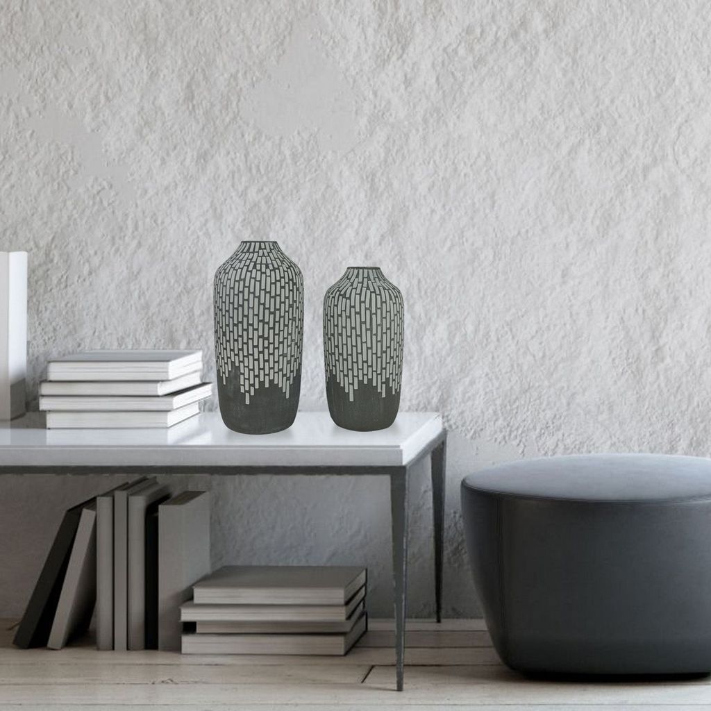 Introducing our captivating set of two Oblong Shaped Vases, a perfect fusion of modern design and timeless elegance. These vases feature a rich, dark gray hue adorned with a stunning white mosaic-like vertical design, creating a visual masterpiece that's sure to elevate your home decor.