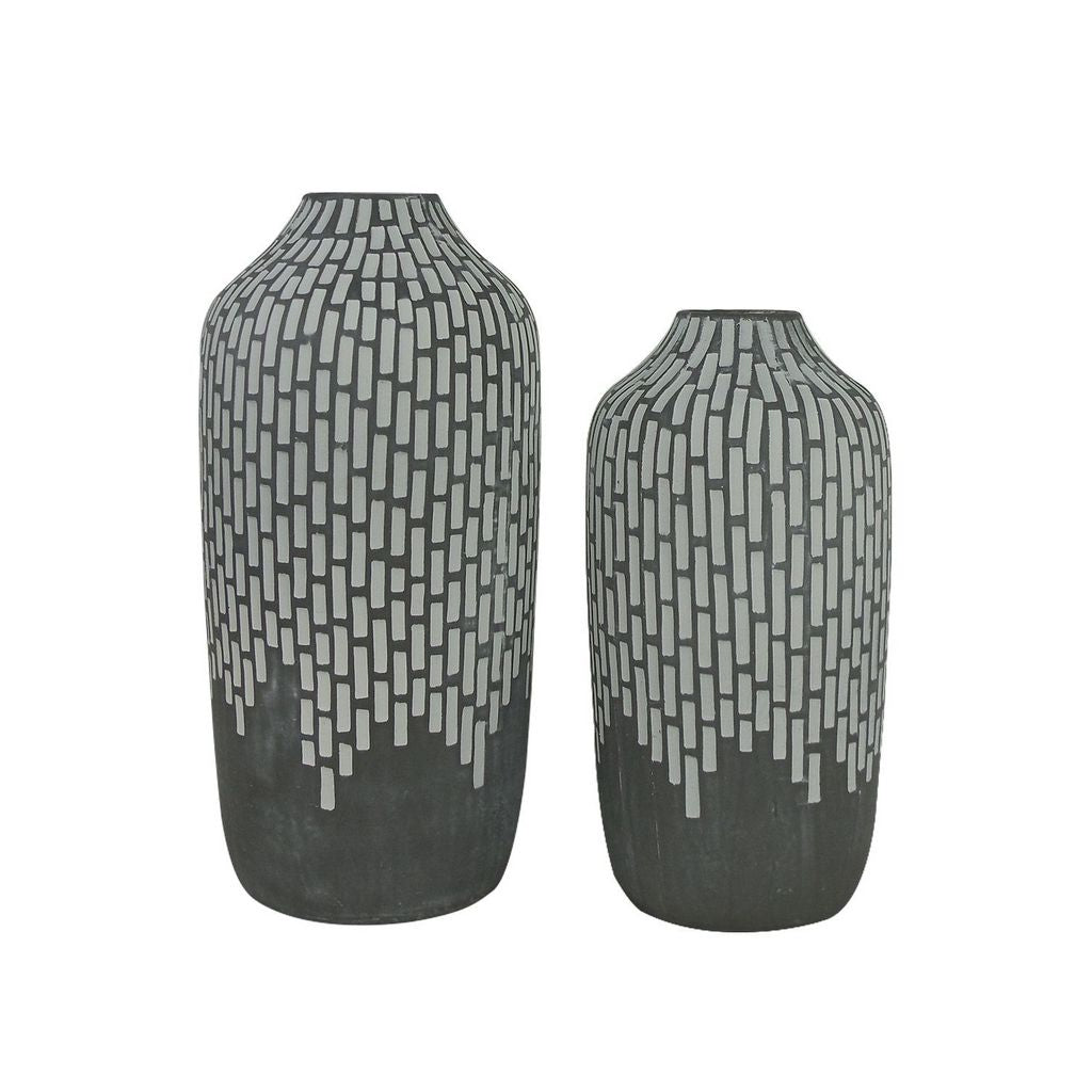 In this set, you'll discover two distinct sizes: an 11-inch vase and a graceful 13-inch vase, allowing you to create dynamic and harmonious displays. The standout feature of these vases is the intricate mosaic-like vertical pattern that adds depth and texture to their surface.