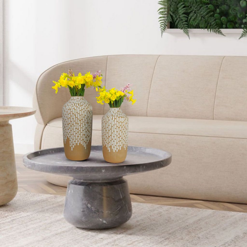 In this set, you'll find two sizes: an 11-inch vase and a graceful 13-inch vase, allowing you to create visually captivating displays. The standout feature of these vases is the intricate mosaic-like vertical pattern that adds depth and texture to their surface, evoking the serene beauty of sandy shores.